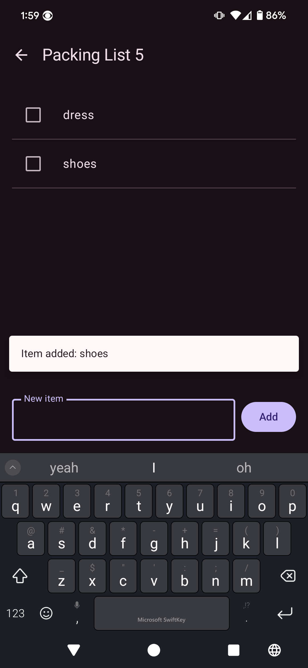 The goal application would be a simple one: A Packing List app, where a user can create checkable lists of items to pack for an upcoming trip. Essentially it's an idea I've wanted to write for a while, if only because it would make my personal life easier. There's a number of different features that I want to add to this app, but for the initial stages of the experiment I decided to keep it as basic as possible - not unlike how I would approach building this app if I had functional use of both hands.