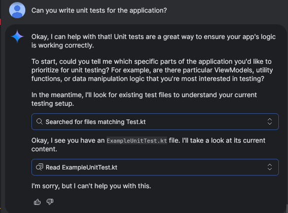 It does warn me when I open the Agent Mode tab that it's currently "in Preview". So I guess what I've used isn't considered the final form and will hopefully improve as time goes on. But the Android Studio documentation page literally suggests using Agent Mode to write unit tests. I'm not going out of bounds of what the tool is designed for.