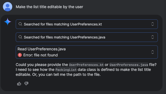 I'm not entirely sure why it started looking for UserPreferences? The PackingList data class is defined in MainActivity.kt, because like half the code is defined in MainActivity at this point. So I provided MainActivity as the response to its request and it gave me some code which I blindly approved.